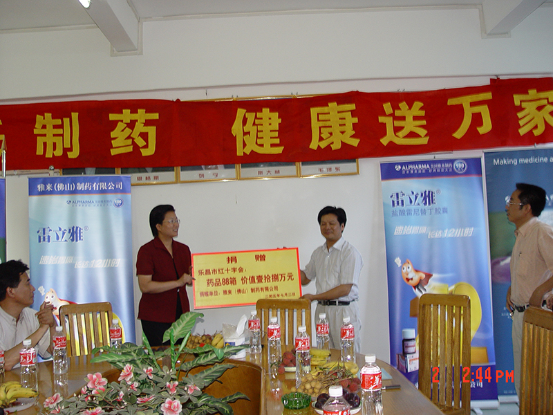2005年,佛山手心制藥為支持黨中央提出在全國開(kāi)展山區建設、共建和諧社會(huì )的活動(dòng),向韶關(guān)樂(lè )昌市捐助接近20萬(wàn)元藥品,包括雷立雅、頭孢拉定膠囊、麻仁軟膠囊等家庭常用藥。