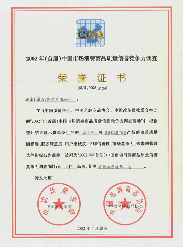 雷立雅-2002年品牌及滿(mǎn)意第一名