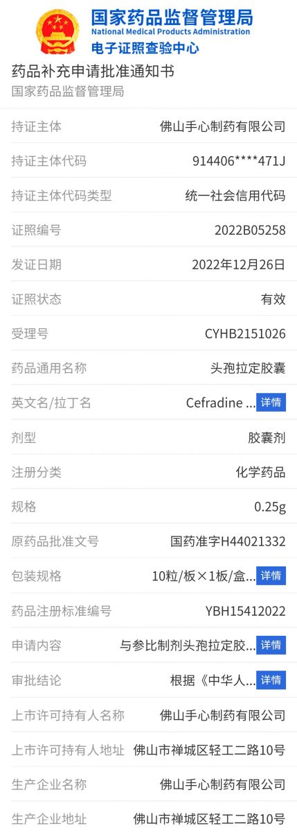 2022年12月29日,佛山手心制藥有限公司收到國家藥品監督管理局12月26日核準簽發(fā)的《藥品補充申請批準通知書(shū)》(受理號:CYHB2151026,通知書(shū)編號:2022B05258),佛山手心制藥生產(chǎn)的頭孢拉定膠囊(0.25g)正式通過(guò)仿制藥質(zhì)量和療效一致性評價(jià)。